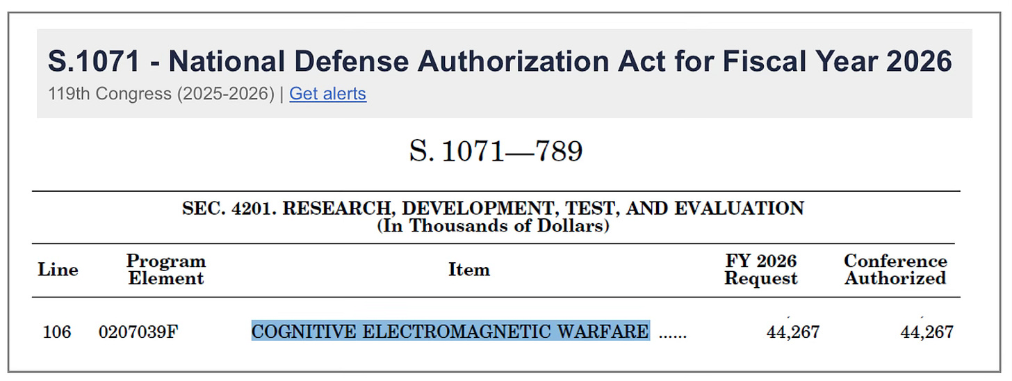 This title signals that the Department of Defense considers “cognitive” effects within the electromagnetic domain to be a legitimate area of capability development, with real dollars attached. The reality (or even feasibility) of this capability has been concealed from us, the American Public, for a long time.